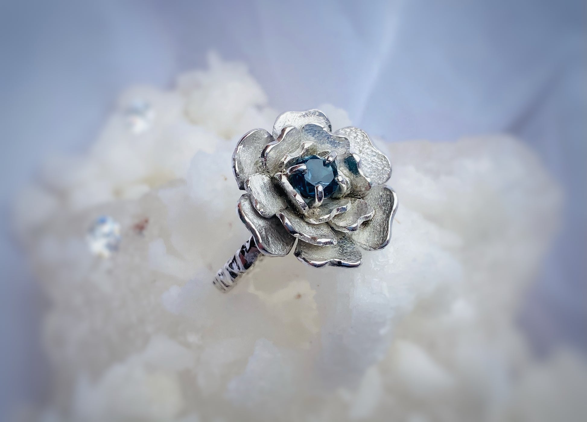 Este anillo está inspirado en esas frías mañanas luego de la lluvia. Una gran rosa escarchada para resaltar en tu mano, cuyos pétalos tienen terminaciones en mate y brillantes, como si tuviese el rocío del amanecer. Y en el centro, un topacio london blue.
