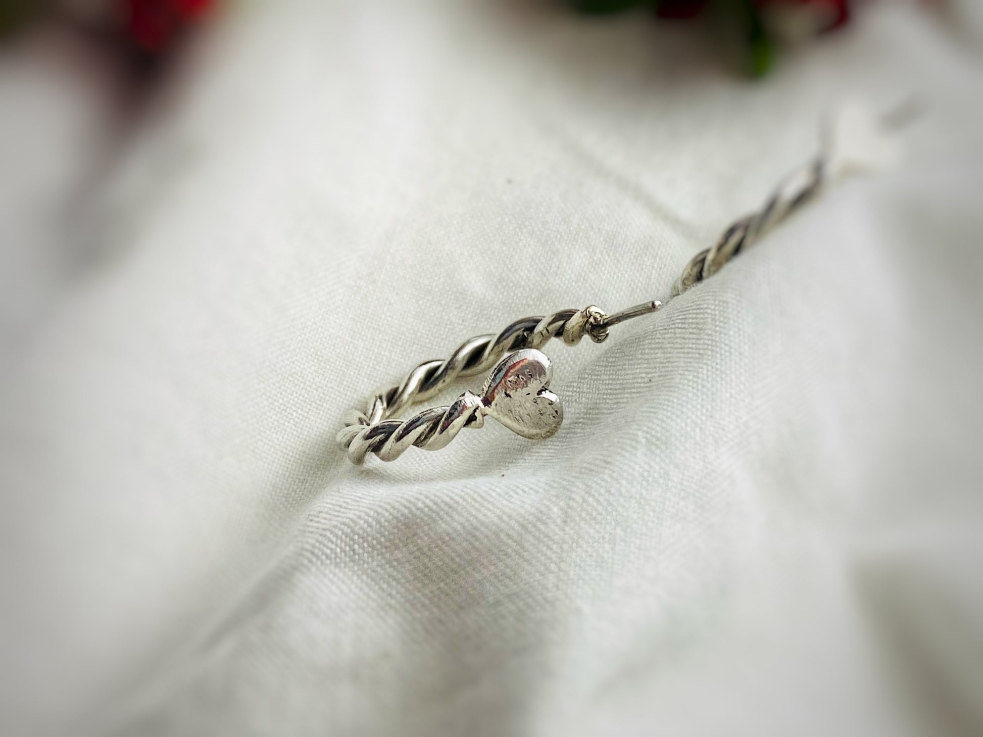 Un clásico aro con hilos de plata entorchado, pero como siempre, con un detalle. En este caso, unos corazones rústicos que cuando tomes tu pelo, lucirán delicados.